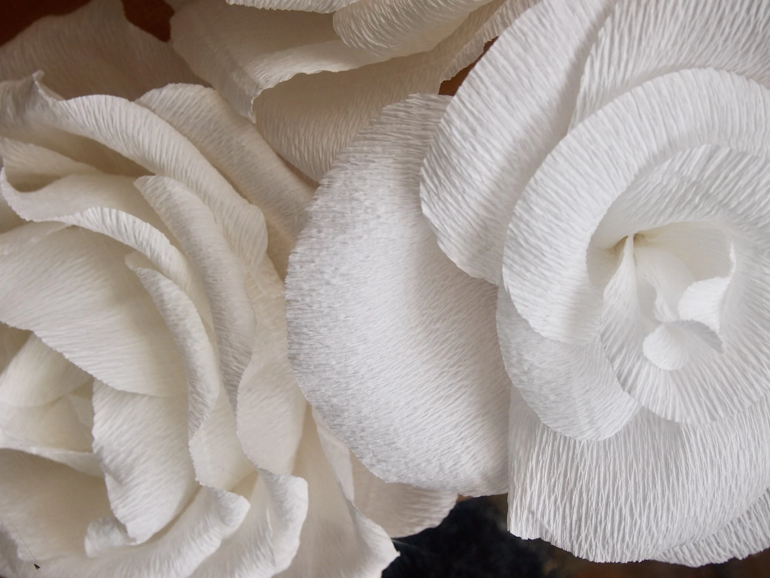 The pale, pristine quality of Malpass’s painting Mauve Over inspired Aurinko to detail the ends of this delicate long scarf with macro photographs of wonderfully textured white crepe paper roses photographed in her Chicago studio.