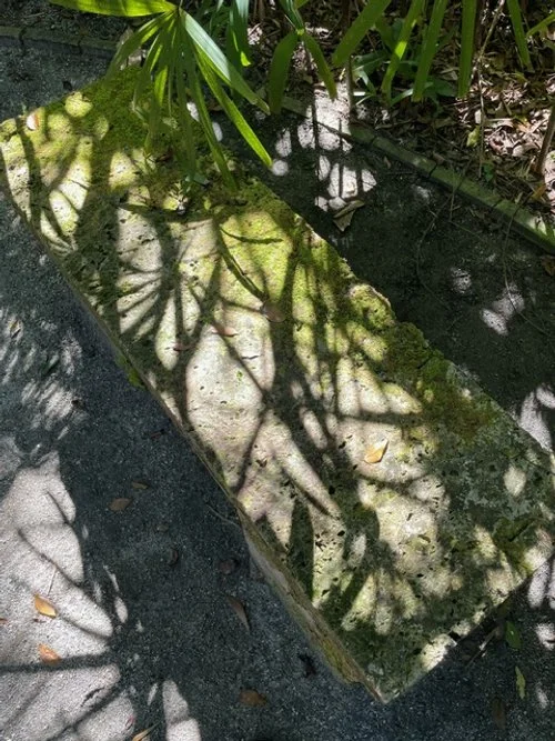 Wandering through the Morikami Japanese Gardens in Delray Beach, Florida, Aurinko was fascinated by the palm shadows falling across a stone bench. This is a straight photograph in which the shadows form abstract forms, and small golden leaves cast their own tiny shadows.